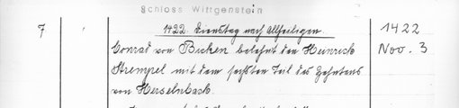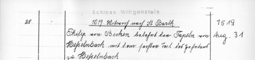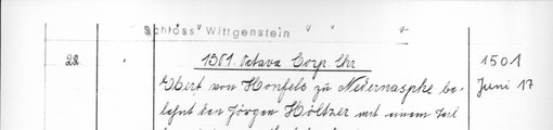 | 1513-02-22 | Archiv: Laasphe, Fürstliches Archiv Benutzungsort: Fürstliches Archiv zu Sayn-Wittgenstein-Hohenstein Bestand: Urkunden | Regest | |