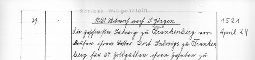 | 1521-04-24 | Archiv: Laasphe, Fürstliches Archiv Benutzungsort: Fürstliches Archiv zu Sayn-Wittgenstein-Hohenstein Bestand: Urkunden | Regest | |