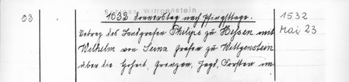| 1532-05-23 | Archiv: Laasphe, Fürstliches Archiv Benutzungsort: Fürstliches Archiv zu Sayn-Wittgenstein-Hohenstein Bestand: Urkunden | Regest | |