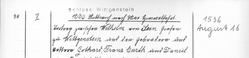 | 1536-08-16 | Archiv: Laasphe, Fürstliches Archiv Benutzungsort: Fürstliches Archiv zu Sayn-Wittgenstein-Hohenstein Bestand: Urkunden | Regest | |