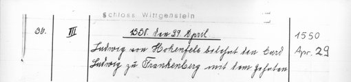 | 1550-04-29 | Archiv: Laasphe, Fürstliches Archiv Benutzungsort: Fürstliches Archiv zu Sayn-Wittgenstein-Hohenstein Bestand: Urkunden | Regest | |