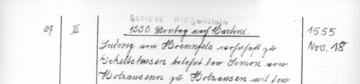 | 1555-11-18 | Archiv: Laasphe, Fürstliches Archiv Benutzungsort: Fürstliches Archiv zu Sayn-Wittgenstein-Hohenstein Bestand: Urkunden | Regest | |