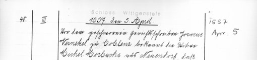 | 1557-04-05 | Archiv: Laasphe, Fürstliches Archiv Benutzungsort: Fürstliches Archiv zu Sayn-Wittgenstein-Hohenstein Bestand: Urkunden | Regest | |