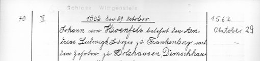 | 1562-10-29 | Archiv: Laasphe, Fürstliches Archiv Benutzungsort: Fürstliches Archiv zu Sayn-Wittgenstein-Hohenstein Bestand: Urkunden | Regest | |
