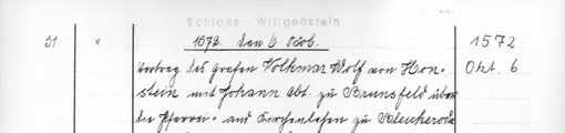 | 1572-10-06 | Archiv: Laasphe, Fürstliches Archiv Benutzungsort: Fürstliches Archiv zu Sayn-Wittgenstein-Hohenstein Bestand: Urkunden | Regest | |