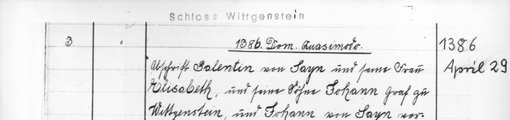 | 1386-04-29 | Archiv: Laasphe, Fürstliches Archiv Benutzungsort: Fürstliches Archiv zu Sayn-Wittgenstein-Hohenstein Bestand: Urkunden | Regest | |