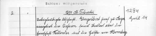 | 1294-04-14 | Archiv: Laasphe, Fürstliches Archiv Benutzungsort: Fürstliches Archiv zu Sayn-Wittgenstein-Hohenstein Bestand: Urkunden | Regest | |