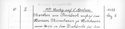 | 1499-12-02 | Archiv: Laasphe, Fürstliches Archiv Benutzungsort: Fürstliches Archiv zu Sayn-Wittgenstein-Hohenstein Bestand: Urkunden | Regest | |