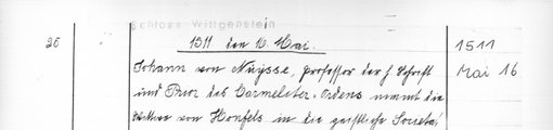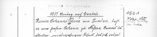 | 1511-05-16 | Archiv: Laasphe, Fürstliches Archiv Benutzungsort: Fürstliches Archiv zu Sayn-Wittgenstein-Hohenstein Bestand: Urkunden | Regest | |
