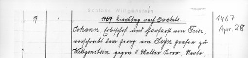 | 1467-04-28 | Archiv: Laasphe, Fürstliches Archiv Benutzungsort: Fürstliches Archiv zu Sayn-Wittgenstein-Hohenstein Bestand: Urkunden | Regest | |
