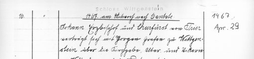 | 1467-04-29 | Archiv: Laasphe, Fürstliches Archiv Benutzungsort: Fürstliches Archiv zu Sayn-Wittgenstein-Hohenstein Bestand: Urkunden | Regest | |