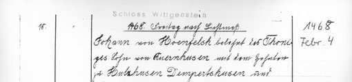 | 1468-02-04 | Archiv: Laasphe, Fürstliches Archiv Benutzungsort: Fürstliches Archiv zu Sayn-Wittgenstein-Hohenstein Bestand: Urkunden | Regest | |