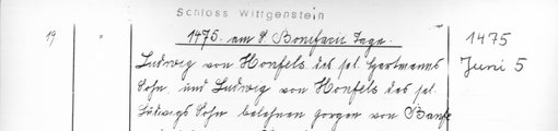 | 1475-06-05 | Archiv: Laasphe, Fürstliches Archiv Benutzungsort: Fürstliches Archiv zu Sayn-Wittgenstein-Hohenstein Bestand: Urkunden | Regest | |