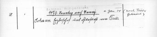 | 1476-01-14 | Archiv: Laasphe, Fürstliches Archiv Benutzungsort: Fürstliches Archiv zu Sayn-Wittgenstein-Hohenstein Bestand: Urkunden | Regest | |