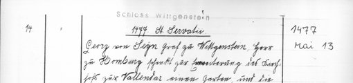 | 1477-05-13 | Archiv: Laasphe, Fürstliches Archiv Benutzungsort: Fürstliches Archiv zu Sayn-Wittgenstein-Hohenstein Bestand: Urkunden | Regest | |