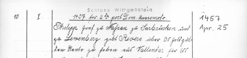 | 1457-04-25 | Archiv: Laasphe, Fürstliches Archiv Benutzungsort: Fürstliches Archiv zu Sayn-Wittgenstein-Hohenstein Bestand: Urkunden | Regest | |