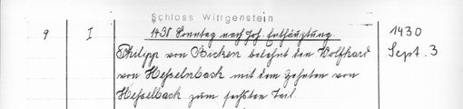 | 1430-09-03 | Archiv: Laasphe, Fürstliches Archiv Benutzungsort: Fürstliches Archiv zu Sayn-Wittgenstein-Hohenstein Bestand: Urkunden | Regest | |