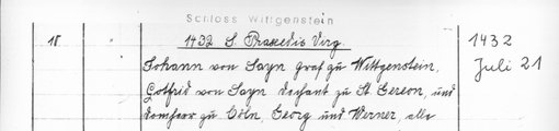 | 1432-07-21 | Archiv: Laasphe, Fürstliches Archiv Benutzungsort: Fürstliches Archiv zu Sayn-Wittgenstein-Hohenstein Bestand: Urkunden | Regest | |