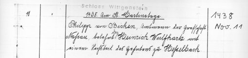 | 1438-11-11 | Archiv: Laasphe, Fürstliches Archiv Benutzungsort: Fürstliches Archiv zu Sayn-Wittgenstein-Hohenstein Bestand: Urkunden | Regest | |