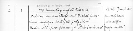 | 1406-06-10 | Archiv: Laasphe, Fürstliches Archiv Benutzungsort: Fürstliches Archiv zu Sayn-Wittgenstein-Hohenstein Bestand: Urkunden | Regest | |