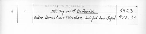 | 1423-11-24 | Archiv: Laasphe, Fürstliches Archiv Benutzungsort: Fürstliches Archiv zu Sayn-Wittgenstein-Hohenstein Bestand: Urkunden | Regest | |