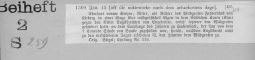 | 1360-01-20 | Archiv: Siegen, Fürstentum - Landesarchiv Benutzungsort: Landesarchiv NRW Abteilung Westfalen Bestand: Urkunden Rorich, Wolf und Johann, Johanns sel. Söhne, Gebrüder von Burbach, bekennen, von den Gütern, womit die Frau Adelheid Gräfin von Nassau ihre, der Brüder, Stiefmutter bewidmet hat, nämlich drei Gütern zu Webelshausen und Winthaen, Mannen der gen. Gräfin zu sein. ispo die bb. Fab. et Sebast. | Regest | |