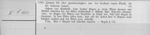 | 1360-01-29 | Archiv: Landsberg-Velen, Gesamtarchiv von (Dep.) Benutzungsort: Landesarchiv NRW Abteilung Westfalen Bestand: Raesfeld Schotte van Eymhorst, Herman van Visbeke und dessen Ehefrau Engele, Tochter Schottes, bekunden, wenn Engele die Güter Lubbertynch und Essinch, die sie von Bittere van Raesfelde zu Lehen trägt, gewinnt, daß sie dann Johann Herrn zu Gemene zur Mitbürgschaft veranlassen wollen. Siegelankündigung Schottes und Hermans. des guedensdaghes nae der hochtyt suonte Pauli do hie bekaert waert | Regest | |
