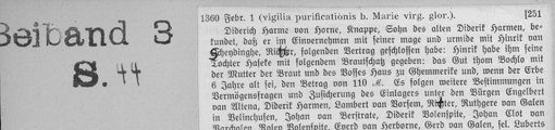 | 1360-02-01 | Archiv: Generalvikariat, Münster, Altes Archiv (GV AA) Benutzungsort: Bistumsarchiv Münster Bestand: Urkunden Diderich Harme von Horne (1), Knappe, Sohn des alten Diderik Harme, schließt mit Hinrik van Scheydinghe, Ritter, einen Vertrag über den Brautschatz, den Hinrik seiner Tochter Haseke in die Ehe mit Diederichs Sohn gibt, darunter das Gut thom Bochlo und des Vosses hus tho Ghemmerike. Nach dem ersten Beilager hat Diedrichs Sohn (2) für seine Frau eine Leibzuchtrente von 35 Malter Korn Hammschen Maßes [. . .] | Regest | |