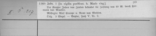 | 1360-02-01 | Archiv: Landsberg-Velen, Gesamtarchiv von (Dep.) Benutzungsort: Landesarchiv NRW Abteilung Westfalen Bestand: Botzlar, Urkunden Der Knappe Johan van Zenden bekundet, daß Herman van Monstere die 40 Mark, über die er eine Schuldurkunde Hermans und seines Bruders Hinriks hatte, bezahlt hat. Siegelankündigung des Ausstellers, des Alf Crampe und Arent van Methlen. | Regest | |