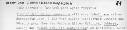 | 1360-02-08 | Archiv: Fürstenberg Benutzungsort: LWL-Archivamt für Westfalen Bestand: Urkunden | Regest | |