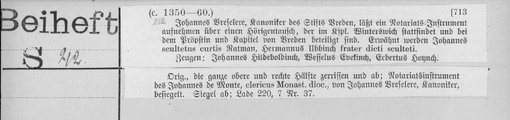 | 1360-01-06 | Archiv: Herford, Stift St. Johann und Dionys Benutzungsort: Landesarchiv NRW Abteilung Westfalen Bestand: Urkunden Dechant und Kapitel der Kirche zu Enger [Angarien] bestätigen, dass sie zu dem Altar der hl. Katharina einige Äcker vor Westerdorpe up den Brock hergegeben haben. | Regest | |