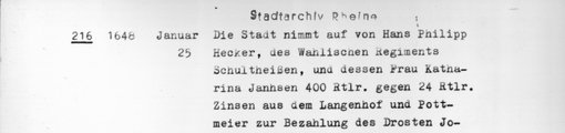 | 1648-01-25 | Archiv: Rheine, Stadtarchiv Benutzungsort: Stadtarchiv Rheine Bestand: AA I Urkunden | Regest | |