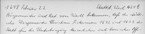 | 1648-02-22 | Archiv: Werl, Stadtarchiv Benutzungsort: Stadtarchiv Werl Bestand: Urkunden | Regest | |