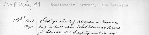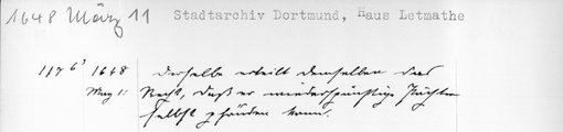 | 1648-03-11 | Archiv: Letmathe (Dep.) Benutzungsort: Stadtarchiv Iserlohn Bestand: Letmathe, Haus, Urkunden | Regest | |