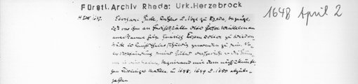| 1648-04-02 | Archiv: Rheda, Fürstliches Archiv Benutzungsort: LWL-Archivamt für Westfalen Bestand: Herzebrock, Urkunden | Regest | |