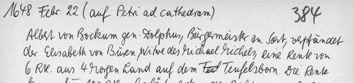 | 1648-02-17 | Archiv: Harkotten II (z. T. Dep.) Benutzungsort: LWL-Archivamt für Westfalen Bestand: Harkotten, Urkunden Vor dem Notar Gerardus Humperdinck erscheint Henrich Mumme zu Henge im Ksp. Everswinkel und bekennt, dass er Herrn Wilhelm Otterstede wegen einer Geldleihe vom 16. Januar 1642 und wegen einer Rechnung für gekaufte Leinwand vom 17. Februar 1648 insgesamt 275 Rtlr. schulde. Er will diesen Betrag ab Fastnacht 1649 bis zur Ablöse mit 5 % verzinsen. Zeugen: Wilbrand Clever und Henrich Kobbingh, Bürger [. . .] | Regest | |